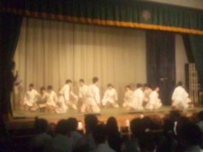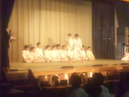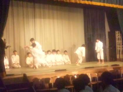 合気道部 演武です。日頃の練習で修得したことを発表します。顧問教諭の説明が加えられながら技が披露されます。