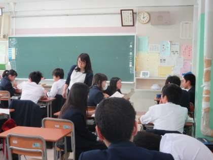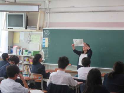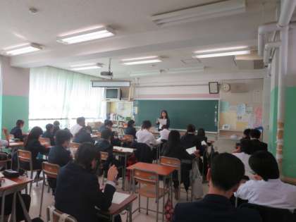 都立杉並総合高等学校の英語科 川崎史子先生による「都立高等学校による訪問授業」が5校時に2年2組、6校時に2年1組で行われました。基本的な語句の発音の反復練習の後、ペア・ワークを行いました。発音で声を出すときは、生徒たちは大きな声を出して、一生懸命に取り組んでいました。