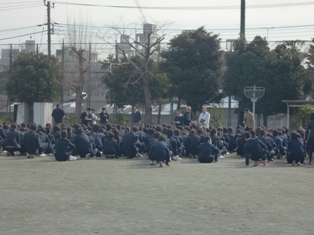 授業時間外に地震が発生したという想定で訓練を行い、校庭、教室、図書室など、休み時間を過ごしていた場所から、各自が避難場所である校庭に避難しました。通常の訓練から学んだことを応用し、安全に気を付けながら、考えて避難行動をとることができました。