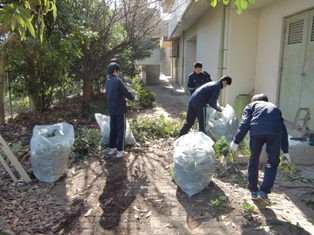学校主事と植栽の整備を行います。説明を聞き、手際よく作業を行います。