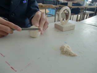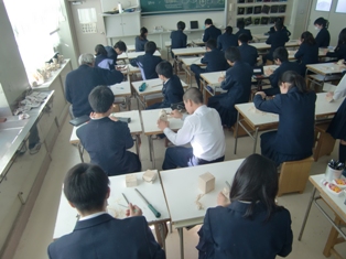 1年・美術では、彫塑に取り組んでいます。バルサ材を使用して、自分のイメージを立体で表現します。各自が用具を選択して、細かな作業が行われています。3年・体育(男子)では、球技で卓球に取り組んでいます。試合形式の授業では、熱が入り、歓声があがります。