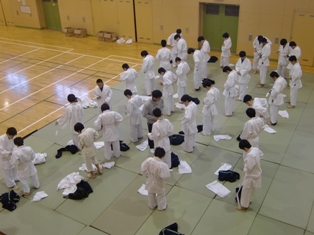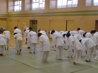 5校時、1年男子・柔道の授業の様子です。柔道衣を初めて着用し、慣れない手つきで帯を締めます。また、柔道の礼法を一つ一つ説明を受けながら実践していきます。