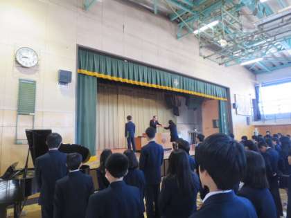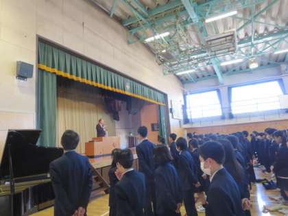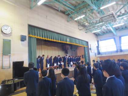 校長先生からは、「みなさん、1年間頑張りました。多くの人たちに見守られていることを実感して、1年間を振り返って次の年度に生かすことが大切です。春休みは、目標をしっかりもって準備をしてください。また、学校は集団生活を学ぶ場です。集団には思いが人数分だけあることを理解して、自分がやるべきことを考えて行動してください。」という話がありました。