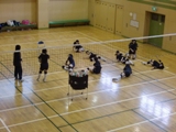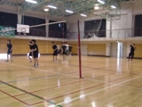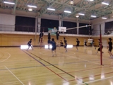 体育館では、男子バレーボール部が練習試合を行っています。両チームともにしっかり声をかけながら、プレーが続きます。格技室では、女子バレーボール部がレシーブの練習を行っています。明日の試合に向けて、練習は続きます。