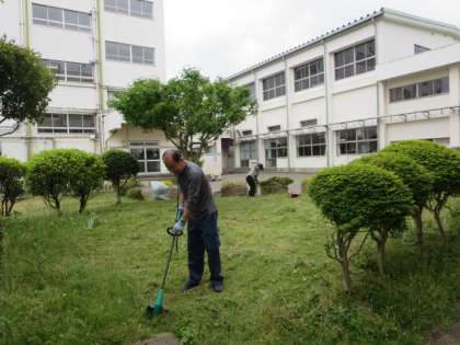 学校主事さんが中庭の草刈りをしています。緑丘中学校の生徒たちが安全に生活できるように環境整備をしています。多くの人たちが、緑丘中学校の生徒を支えています。