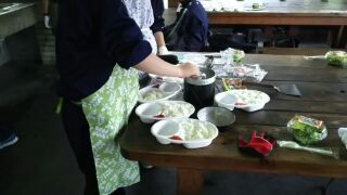 ご飯がふっくら炊き上がり、盛り付けをしています。