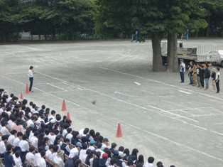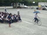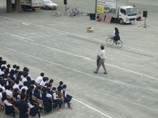 自転車実技教室の様子です。代表生徒による自転車乗用の体験が行われ、蛇行したり、傘をさしたり、悪路を想定して縄ばしごの上を走ったりするなどの状況での運転を体験しました。最後に代表生徒がお礼の言葉を述べました。スタントプロダクションの方から「どきっ、ひやっという気持ちを体験してもらうための事故再現をしました。」という話のとおり、大勢の生徒が今回の教室を通して交通事故の模擬体験ができました。この教室で学んだことを基に、安全への意識を一層高め、自身の行動に反映させてほしいと思います。