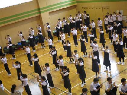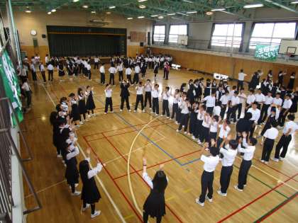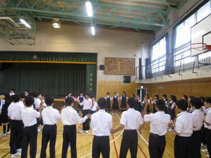 明日の体育大会に向けて、最後の応援練習をしました。あいにくの雨で、各色とも室内での練習となりましたが、3年生が応援団の人たちを中心に1、2年生を引っ張っていました。3年生の、体育大会にかける意気込みが伝わってくる応援練習でした。
