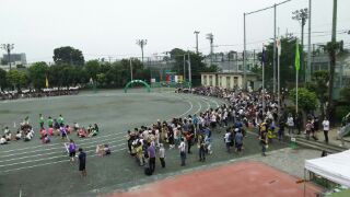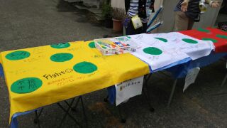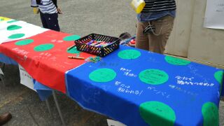 今日の体育大会にはたくさんの保護者の方や地域の方が来校されています。PTAの方が来校された方に、生徒への応援メッセージを書いてもらっています。リレーの時に旗にして応援する予定です。