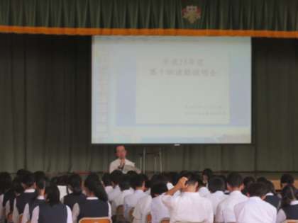 第1回進路説明会を体育館で行いました。生徒と保護者に向けて、進路についての具体的な内容について、配布した資料とパワーポイントを使った説明を3学年進路担当の教員が行いました。本日の話が、進路について考えるきっかけになればよいです。