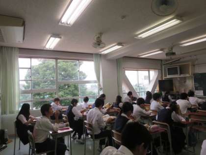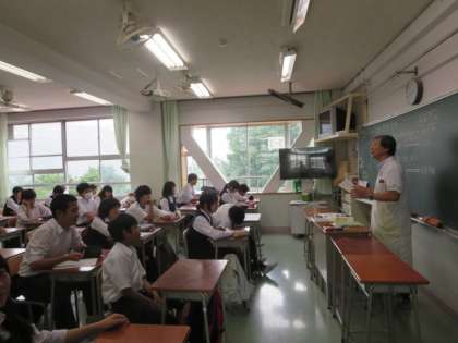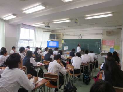 教育指導課の指導主事の先生を講師としてお招きして、教科「日本語」の校内研修会として3年生の全クラスで研究授業を行いました。歌舞伎についての基本的な事柄について学習しました。生徒たちは、教員からの説明や画面に映し出された歌舞伎に関しての画像を見て、歌舞伎に対しての興味・関心を高めることができました。