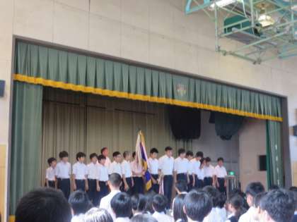本日の全校朝会では、男子バレーボール部が世田谷区大会優勝、ブロック大会3位入賞、ソフトテニス部男子団体が、世田谷区大会3位入賞の表彰がありました。両部活とも、東京都大会に出場します。