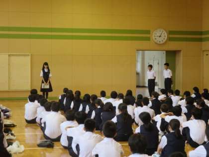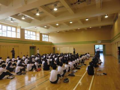 7月6日(水)から8日(金)に行われる河口湖移動教室の事前指導を、1校時格技室で行いました。担当の先生から行程の確認や注意事項が話をされ、各係長から、係の仕事の内容と係りからのお願いの話をしました。