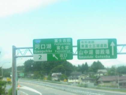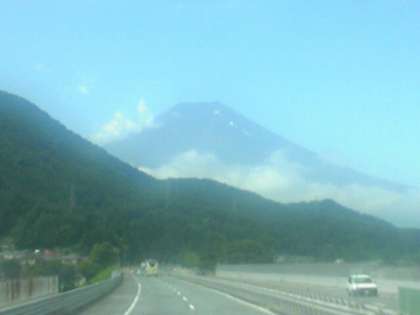 青空に富士山。河口湖ICに着きました。ここから、1、2組は、富士山レーダードーム館などを、3、4組は、富士湧水の里水族館を見学し、富士山レーダードーム館前の広場で昼食をとります。昼食後は、見学場所を入れ替えて見学します。