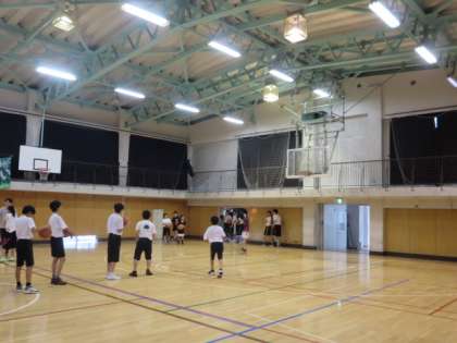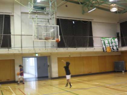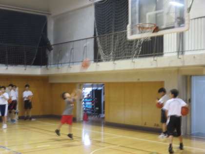 本日の部活動体験は、バスケットボール部です。小学生の皆さんが、中学生と一緒にシュート練習を行っている様子です。