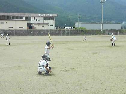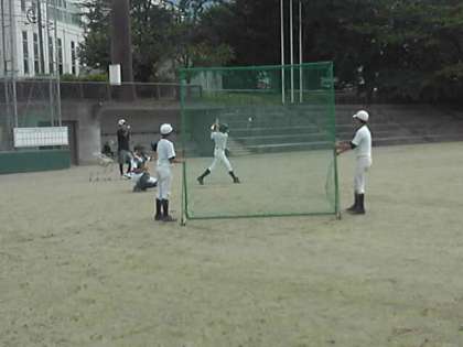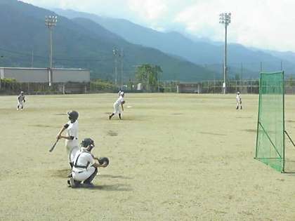 野球部の練習の様子です。天気に恵まれ、自然に囲まれた広いグランドでの練習です。