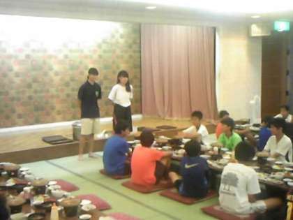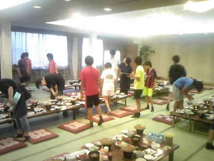 夕食の様子です。配膳を速やかに担当の部が行い、全員でいただきます。合宿最後の夕食です。食後は、各部の予定で過ごします。