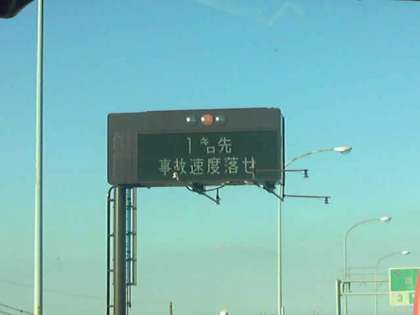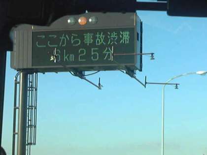 調布の出口を通過しました。ここから1キロメートル先が事故地点です。渋滞区域通過まで25分の表示です。生徒たちは、上手に時間を過ごしています。17:42