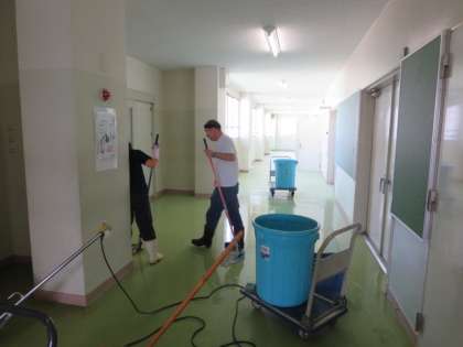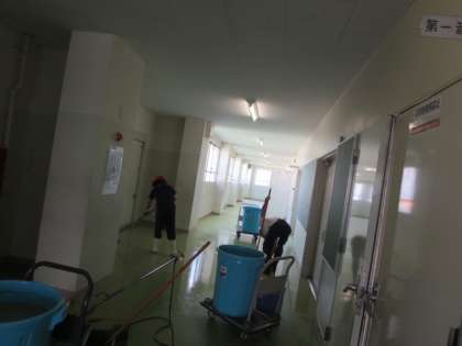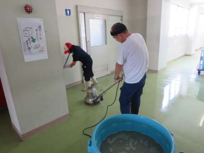 南校舎4階の廊下を、主事さんがワックスがけをしています。これ以外にも夏休みに南校舎の廊下やトイレの床ををワックスがけしてくれました。生徒の皆さんが気持ちよく学習できるよう、環境整備を行っています。