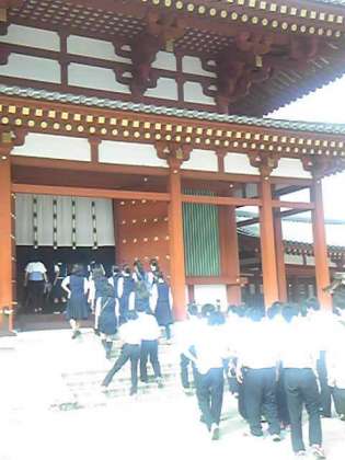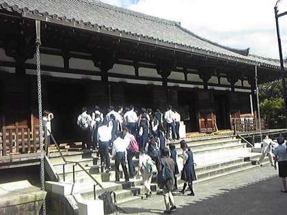 金堂の見学後、お坊さんのお話に聴きいりました。薬師三尊像や聖観世音菩薩像、東院堂などの国宝に触れることができました。奈良公園に向かいます。