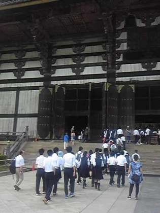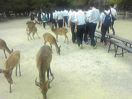 奈良公園に到着し、鹿の歓迎を受けました。集合写真撮影後、班行動で大仏殿などを見学しました。