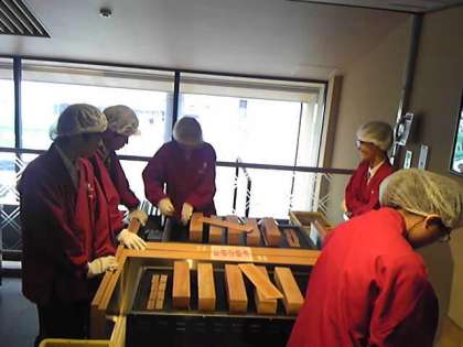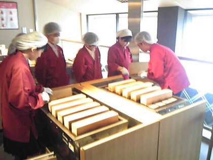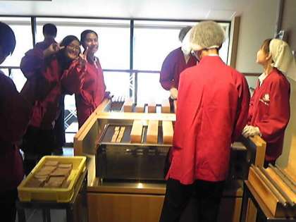 井筒八ッ橋本舗での体験学習の様子です。焼八ッ橋を手際よく作ります。ニッキの香りが部屋にひろがります。