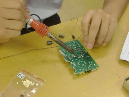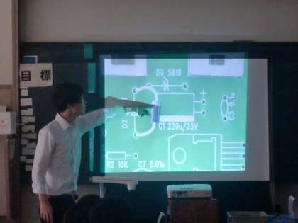 本日行う組み立て作業の前に、実物投影機で映し出された部品の説明や取り付け方、組み立てのポイントが説明されました。はんだごてを使いながら部品の取り付けが、慎重にすすみます。