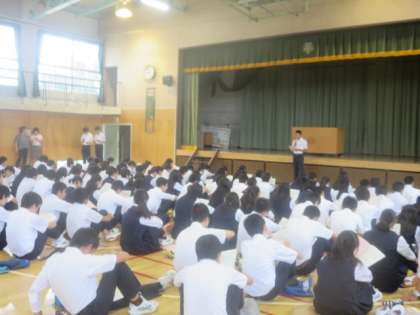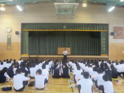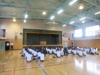 本日1校時に、明日実施される2年生校外学習の事前指導を体育館で行いました。実行委員が司会をし、校外学習における最終確認を行いました。生徒たちは真剣に話を聞いていました。校外学習のスローガンである「一人一人が自分の行動に自覚を持ち、周囲の人に対する気づかいを大切にし、みんなが楽しめる校外学習にしよう」を実現するために、責任をもって行動してほしいと思います。
