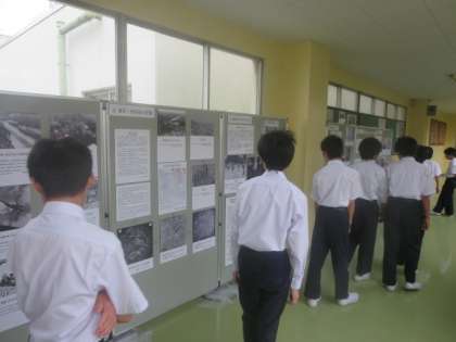 本日1校時に1年生が、世田谷区立平和資料館中学校巡回展の見学を行いました。ワークシートを使って、「印象に残ったこと、平和のために自分ができることは何か」を書きました。今回の巡回展で、戦争に関する写真や実物を見て、感じたり考えたことを大事にしてほしいと思います。