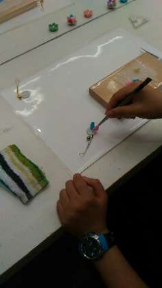 つまみ細工ストラップ作りに集中して取り組んでいます。完成間近です。