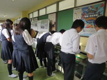 本日6校時に3年生が、世田谷区立平和資料館中学校巡回展の見学している様子です。各自メモを取りながら、意欲的に見学しています。3年生のこの姿勢は、1、2年生の手本となるものです。今回の見学を通じて、感じたことや考えたことは、これからの人生において大きな糧となることでしょう。