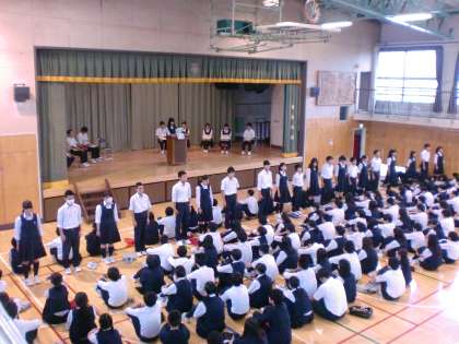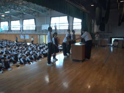 10月8日(土)に生徒会引継会が行われました。「学校の諸活動を生徒会が主体的に進めているという意識をもたせ、そのことを全生徒が確認する」という目的のもと、後期生徒会役員、各専門委員会の委員長から後期の活動方針・活動内容が発表されました。また、前生徒会役員からのメッセージが披露されました。その後、9月30日(金)に行われた世田谷区立中学校陸上競技大会の入賞者の表彰が行われました。