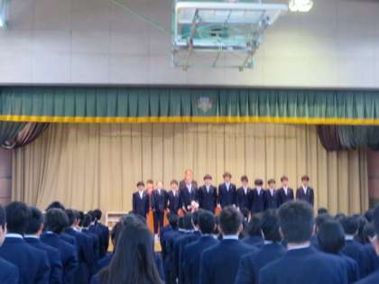 本日全校朝会が行われました。まずはじめに、男子バレーボール部、女子バレーボール部、バドミントン部、NIEの表彰を行いました。