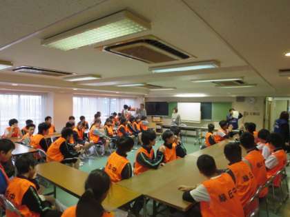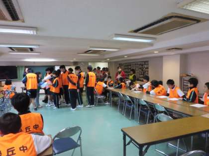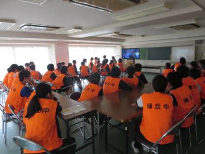 訓練に参加する緑丘中学校の生徒たちが、ミーティングルームで避難所運営委員の方から説明を受けている様子です。