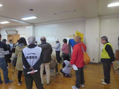 簡易トイレについての説明を受けている様子です。
