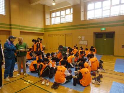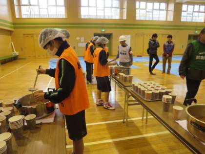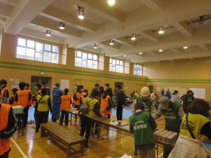 訓練で炊き出しをしたご飯と豚汁を試食している様子です。緑丘中学校の生徒が配膳をしています。