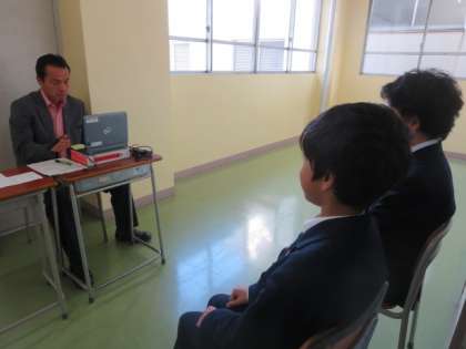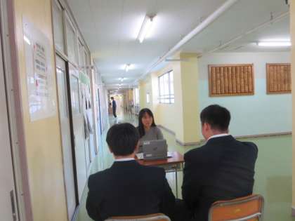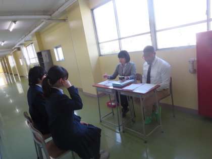 3年生の英語、少人数授業で、スピーキングテストを行っている様子です。