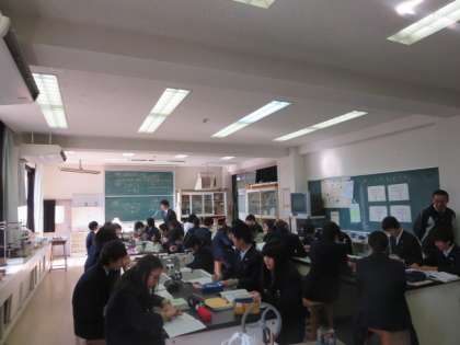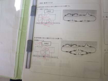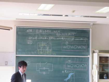 本校の1年目の理科の教員が校内研究授業を行いました。理科室で、2年生の理科の学習内容である、直列回路、並列回路における電圧の関係についての実験を行いました。生徒たちは、教員の指示に従って、順序良く電圧の測定を行っていました。
