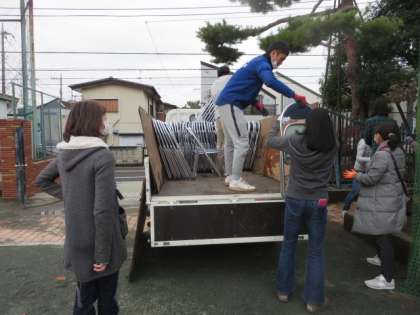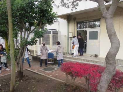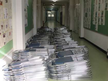世小P4ブロック合同研修会(経堂小会場)の講演会が11月29日に行われましたが、緑丘中学校からパイプ椅子を350脚お貸ししました。経堂小学校のPTAの方がパイプ椅子を運んでいる様子です。パイプ椅子を2階の体育館から1階に運んでくれたのは、バスケットボール部の生徒たち、1階から2階の体育館に戻してくれたのはバドミントン部の生徒たちです。生徒たちは頑張ってくれました。
