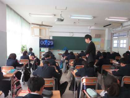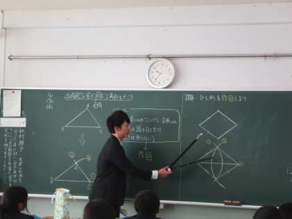 本校の1年目の数学の教員が「いろいろな作図 「基本の作図」」という内容で校内研究授業を行いました。平面図形の基礎についての小テストの後、三角形やひし形などの作図の方法を丁寧に説明しました。