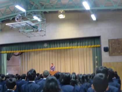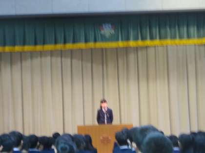 全校朝会を行いました。校長先生からは、「3学期が始まって、1週間経ちました。個人や学年の目標を確認して、しっかりと成長できるようにしてください。1月の人格の完成は「感謝」です。感謝の気持ちを表情や行動で表せるようにしてください。14日(土)に三年生を励ます会がありました。3年生から、自分たちが今まで1、2年生たちに支えられていたという話があったことは、うれしいことです。1月28日(土)に14歳の成人式が行われます。本校からも2年生2名が発表者の一員として参加します。」などの話がありました。生徒会からは、「うがい・手洗いをして、健康管理をしましょう」という話がありました。生活指導主任の先生からは、「体調管理をしっかりしましょう。集団になったときに、意識をもって行動するようにしましょう。」という話がありました。