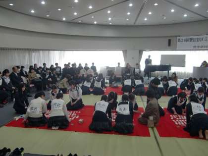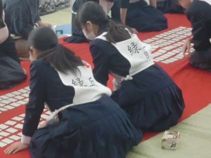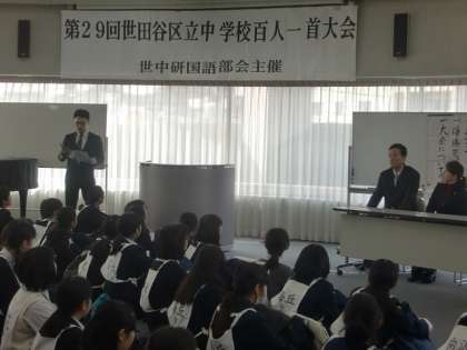 3月4日(土)、世田谷区教育センターで「第29回世田谷区立中学校百人一首大会」が開催されました。この大会は、世田谷区立中学校の各校代表の一組が参加して行われる競技会です。本校からは、2年女子と3年女子のペアが参加しました。予選リーグを勝ち抜き、決勝トーナメントに進み、5位(ベスト8)となりました。会場は、静粛な緊張感にあふれた雰囲気に包まれ、選手たちの真剣な対戦が繰り広げられました。