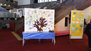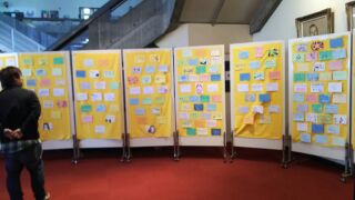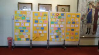 合唱コンクールに向けての応援メッセージがホールに並べられています。
