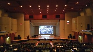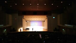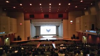 全クラスの合唱が終わり、3年生を送る会を行っています。生徒会役員が心を込めて作成した3年間のスライドショーに盛り上がっています。