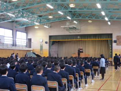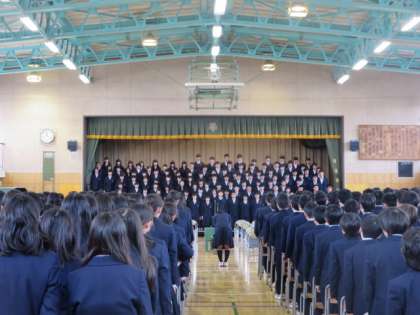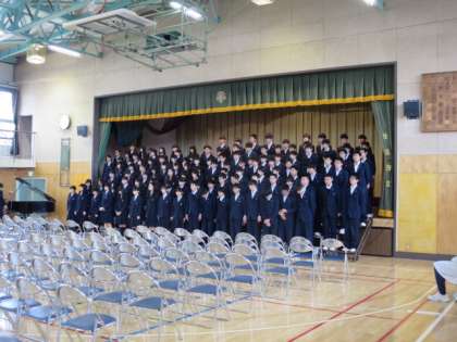 卒業式の予行を行いました。卒業式の流れを一通り行い、修正を行いました。前半は厳かな雰囲気で進み、後半は卒業式で歌う合唱の練習を行いました。気持ちを込めて歌っている生徒たちの表情は素晴らしいものでした。卒業式当日は、参列した人たちを感動させてくれる合唱を披露してくれることでしょう。