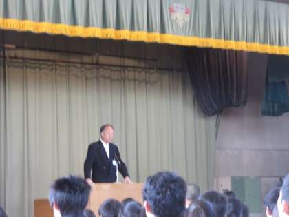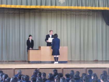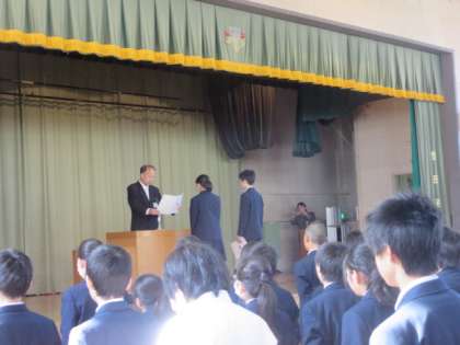 生徒の表彰を行った後、平成28年度の修了式を行いました。校歌斉唱の後1年生と2年生の代表生徒に校長先生から修了証が授与されました。その後の校長先生の話、生活指導主任の先生の話を生徒たちは真剣に聞いていました。