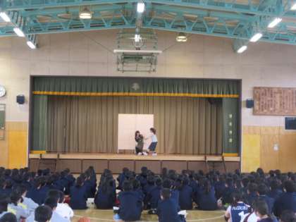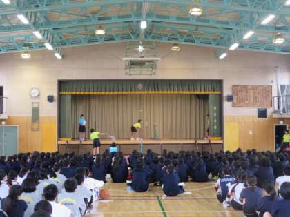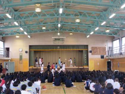 演劇部とソフトテニス部、サッカー部の部活動紹介の様子です。
