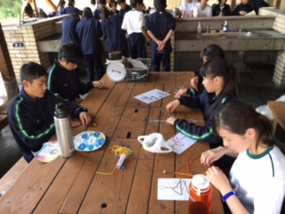 片付けが終わった班から、組み紐体験です。班で協力して、上手に編みましょう。