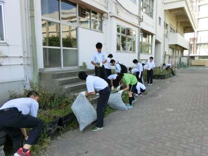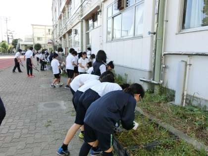 草取りボランティア 公開日 2017/05/24 更新日 2017/05/24 今日のできごと 5月23日に、緑のボランティア部の呼びかけで、76名の生徒が集まり、南校舎前の花壇周辺の草取りを行いました。体育大会前に、花壇周辺がきれいになりました。 いいね(0)