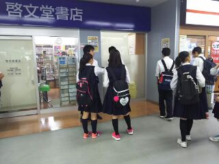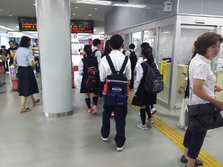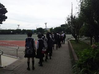 歌舞伎鑑賞教室に出発です。学校を出る様子と桜上水班行動チェックの様子です。